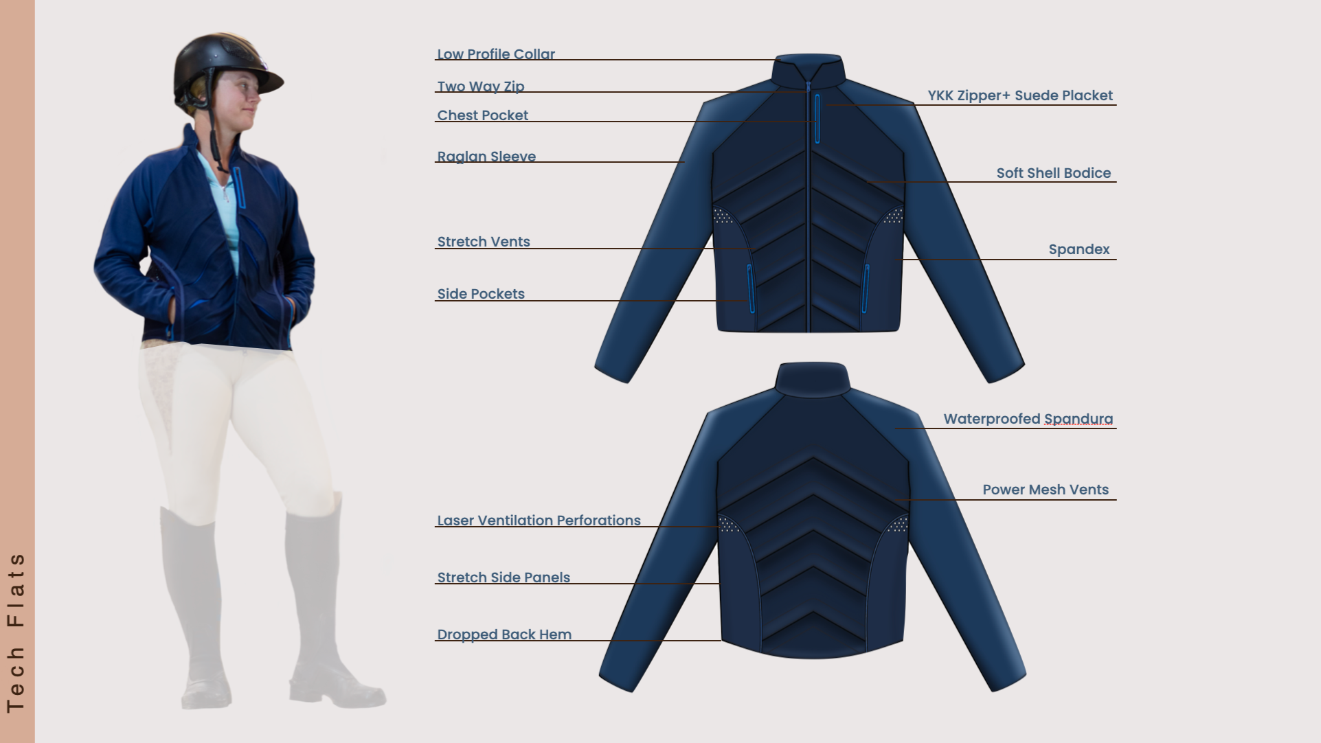 My design process began with a mood board for inspiration. After this, I began sketching various ideas to hone my vision. From here, prototypes were created physically and digitally. Once they were wearable, four rounds of garments were tested with local professional equestrians.